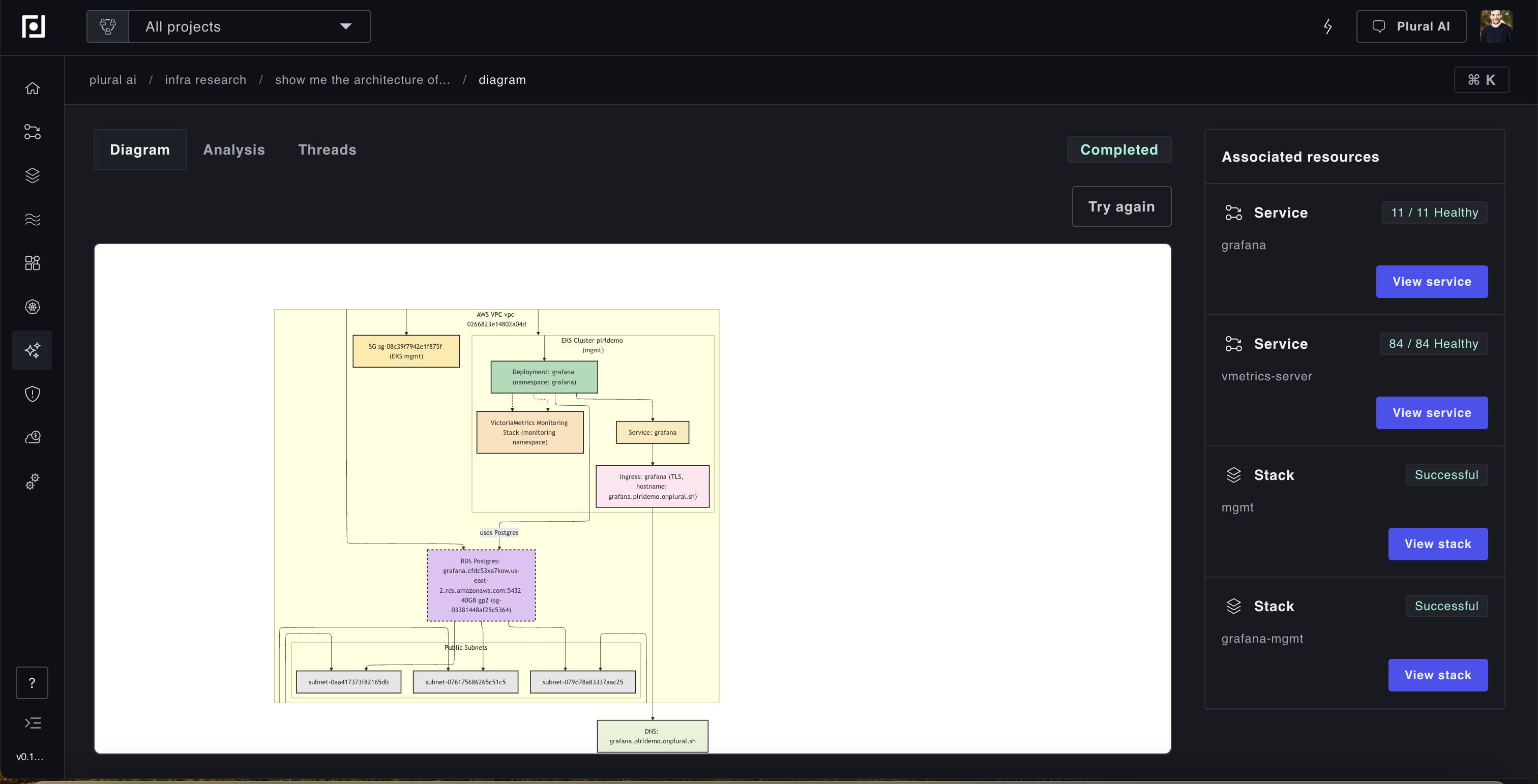 Diagram creation is simple and UI-based. Navigate to AI -> Infra Research. You'll have a prompt button to spawn a new research, and from there you'll see a few threads spawn in as the AI is working in the background. The process takes about 1-2 minutes, and is completely headless, so feel free to grab a coffee while its churning. Once done, you'll have a full result looking something like (using the prompt Show me the architecture of the grafana deployment):